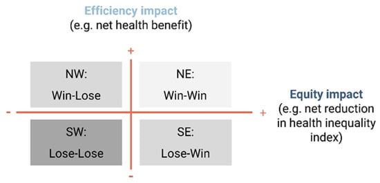 Equity-efficiency impact plane. NE: north-east; NW: north-west; SE: south-east; SW: south-west (based on [37]).