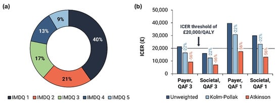 (a) MenB cases prevented across equity strata and (b) the impact of including equity benefits on cost-effectiveness. ICER: incremental cost-effectiveness ratio; IMDQ: index of multiple deprivation quintile; MenB: MenB-related cases of invasive meningococcal disease; QAF: quality-of-life adjustment factor; QALY: quality-adjusted life-year.