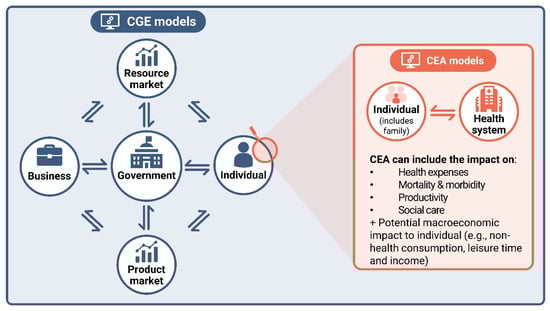 Illustrative diagram of the different elements that could be included in a CGE model and links with microeconomic CEA models. CEA: cost-effectiveness analysis; CGE: computable general equilibrium.