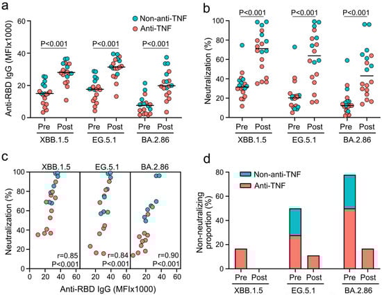 Systemic antibody responses and corresponding virus neutralization induced by XBB.1.5-adapted mRNA vaccines in patients with IBD. (a) Median serum levels of omicron subvariant-specific anti-RBD IgG before (pre) and 2–4 weeks after (post) vaccination. (b) Median serum-mediated neutralization of indicated omicron subvariants before and after vaccination. Neutralization is based on antibody-mediated inhibition of binding between ACE2 and the indicated RBDs. (c) Bivariate correlation between subvariant-specific anti-RBD IgG levels and respective virus neutralization 2–4 weeks after vaccination. Correlation coefficients are provided as Spearman’s rho and corresponding p values. (d) Proportions of individuals who fail to neutralize the indicated subvariants before and after vaccination. Statistical analyses in (a,b) are based on exact Wilcoxon signed-rank tests. Color code: anti-TNF-treated patients are depicted in red, and non-anti-TNF-treated patients are displayed in blue.