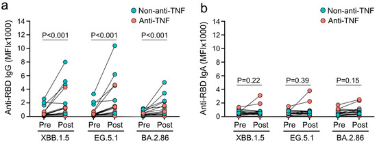 Mucosal antibody responses induced by XBB.1.5-adapted mRNA vaccines in patients with IBD. Omicron subvariant-specific anti-RBD IgG (a) and IgA (b) levels in saliva, before (pre) and 2–4 weeks after (post) vaccination. Statistical analyses are based on exact Wilcoxon signed-rank tests.