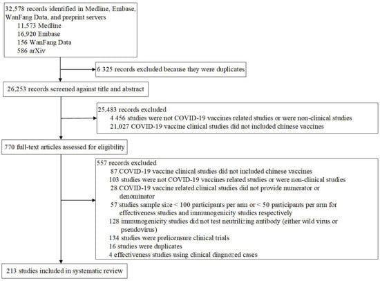 Studies on COVID-19 vaccines based on human subjects published between 1 May 2020 and 31 May 2022, were identified following the PRISMA guidelines for systematic reviews [17]. Scientific articles published in English and Chinese languages were sought for through searching Medline, Embase (which contains preprints in medRxiv and bioRxiv), and WanFang Data (a Chinese literature service platform). Standardized medical subject heading (MeSH) terms, namely SARS-CoV-2, COVID-19, and vaccine, were established for searching. Considering the rapid mutation of the virus and the resulting changes in the vaccines’ effectiveness in the population, to ensure timely dissemination of the characteristics of the Chinese-made vaccines, preprint studies were searched for on the arXiv servers using the search term “((SARS-CoV-2) OR (COVID-19)) AND (vaccine)”. In addition, SSRN (https://www.ssrn.com/ (accessed on 31 May 2022)) and Research Square (https://www.researchsquare.com/ (accessed on 31 May 2022)) were searched for preprint literature containing the words “((SARS-CoV-2) OR (COVID-19)) AND (vaccine)” in the title, abstract, and keywords, which were also downloaded. The search was initiated on 2 June 2022, with no language restrictions. Prior to the literature search, a pilot study was conducted to refine the MeSH terms and combinations thereof, especially when the terms were translated to Chinese, prior to searching the non-English electronic databases.