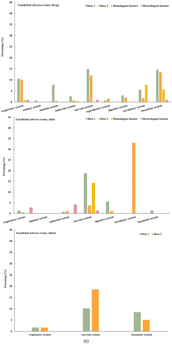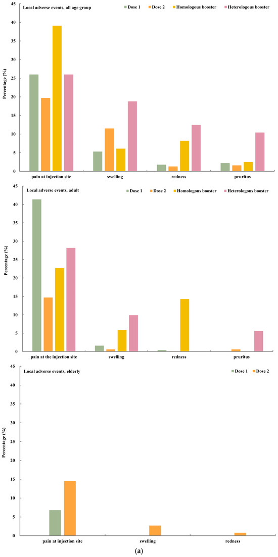 Adverse events after vaccination among three populations (all age, adults, elderly). (a) Solicited local adverse events. (b) Solicited systematic adverse events. (c) Unsolicited adverse events.