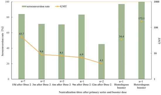 Neutralizing antibodies for the ancestral strain of the live SARS-CoV-2 virus after the primary series and boosters. The bar graphs indicate the trend of the seroconversion rate after two doses of inactivated vaccinations or booster immunization. The line graph connected by yellow dots indicates the trend of GMT after receiving two doses of the inactivated vaccine; the dots for booster immunization are not connected, just displayed.
