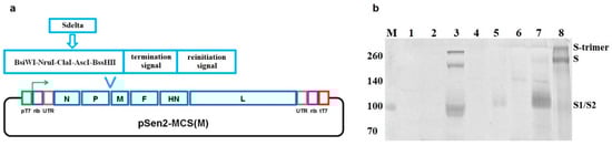 Figure 1. The schematic generation of recombinant virus Sen-Sdelta(M) (a) and Western blot analysis of Sdelta transgene expression (b). (a) The arrow indicates the direction of viral genomic RNA synthesis; pT7—promoter; TT7—terminator of T7 polymerase; rib—ribozyme. (b) M—molecular weight marker (kDa); 1—lysate of uninfected LLC-MK2 cells (negative control); 2—lysate of LLC-MK2 cells infected with the original vector strain of the Sendai virus; 3—lysate of LLC-MK2 cells infected with Sen-Sdelta(M); 4—cultural medium of LLC-MK2 cells infected with the original vector strain of the Sendai virus; 5—cultural medium of LLC-MK2 cells infected with Sen-Sdelta(M); 6—allantoic fluid of chicken embryos infected with the original vector strain of the Sendai virus; 7—allantoic fluid of chicken embryos infected with Sen-Sdelta(M); 8—S-trimer, developed in transformed CHO-K1 cells, 200 ng (positive control).