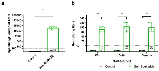 Figure 2. The specific IgG endpoint titers against delta VOC measured by ELISA (a), and the neutralizing titers against delta and gamma VOCs and the Wuhan strain of SARS-CoV-2 determined through neutralization assays on Vero E6 cells (b), in the blood serum of BALB/c mice at 28 days following intranasal immunization with Sen-Sdelta(M). Each data point represents an individual titer, with the tops of the histograms indicating the geometric mean titer (GMT), and vertical lines representing the 95% confidence intervals (95% CI). Horizontal drop lines denote the thresholds for IgG (<1:100) and neutralizing titers (<1:10), with values below these thresholds estimated as 1:40 and 1:5, respectively, for GMT calculations. ** p < 0.01.