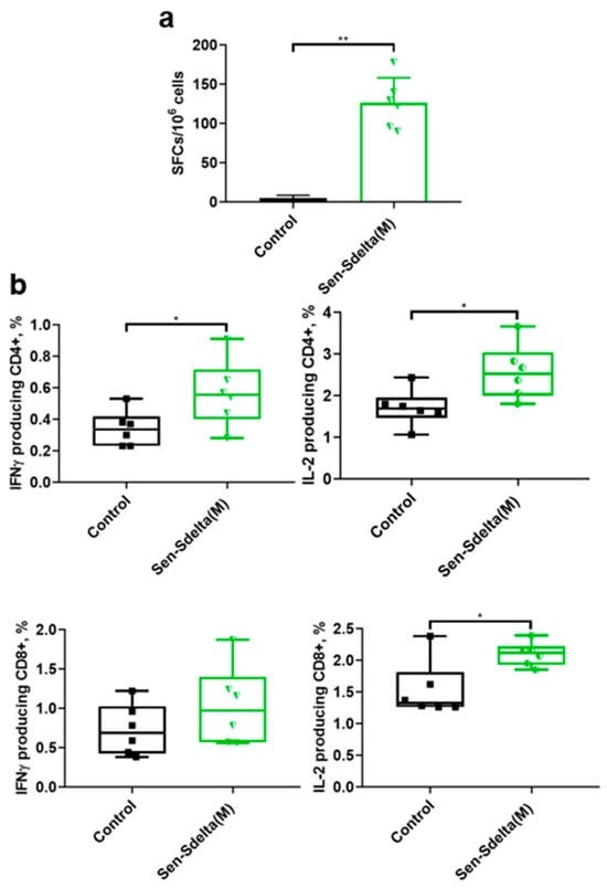 Figure 3. Cellular immune response in BALB/c mice evaluated by ELISpot (a) and ICS (b). (a) Number of splenocytes producing IFN-γ in response to specific stimulation, per 106 cells. (b) Percentage of SARS-CoV-2-specific cytokine-producing CD4+ and CD8+ T-cells. Individual values are represented by dots, mean values by lines. The upper and lower edges of rectangles represent the boundary of the 95% CI. * p < 0.05, ** p < 0.01.