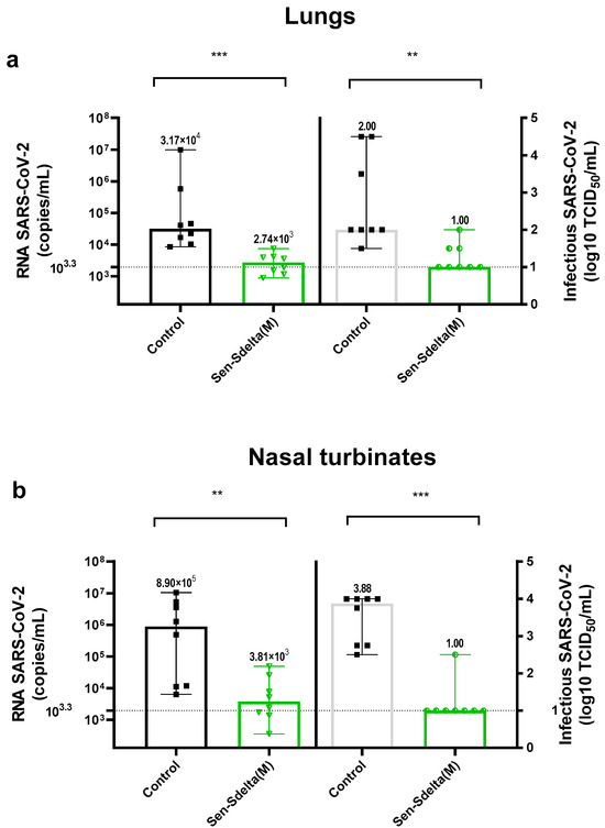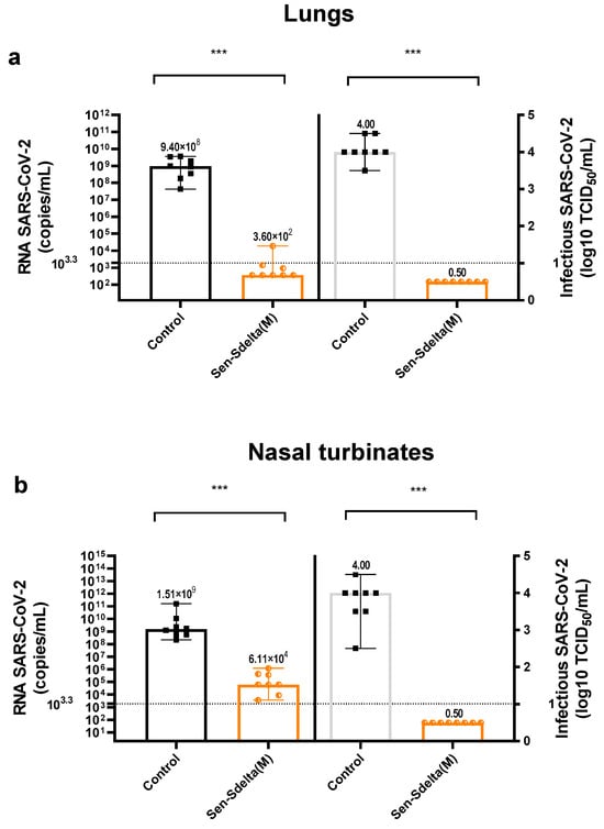 Figure 6. The viral load in the lungs (a) and nasal turbinates (b) of Syrian hamsters measuring 6 days after intranasal infection with the SARS-CoV-2 delta VOC. Viral RNA concentration (copies/mL) in 10% tissue homogenates is indicated on the left side; virus infectious titer on Vero E6 cells (log10 TCID50/mL) is presented on the right side. Each data point represents an individual value, with the tops of the histograms indicating the group medians, and vertical lines representing the 95% CI. Horizontal drop lines denote the thresholds for RNA SARS-CoV-2 (≤103.3 copies/mL) and infectious titers (≤log10 TCID50/mL). *** p < 0.001.