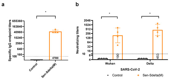 Figure 5. The specific IgG endpoint titers against the delta variant of SARS-CoV-2 measured by ELISA (a), and the neutralizing titers against the Wuhan and delta variants determined through neutralization assay on Vero E6 cells (b). Each data point represents an individual titer, with the tops of the histograms indicating the GMTs, and vertical lines representing the 95% CI. Horizontal drop lines denote the titers’ thresholds for IgG (<1:100) and neutralizing titers (<1:10), with values below these thresholds estimated as 1:40 and 1:5, respectively, for GMT calculations. * p < 0.05.