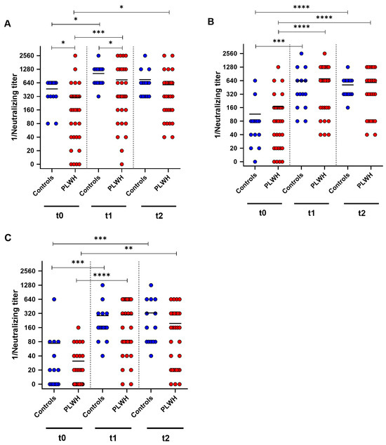 SARS-CoV-2-specific neutralizing antibody titers before (t0), one month (t1), and three months (t2) after Comirnaty Omicron XBB.1.5 vaccination in PLWH and healthy controls. The reciprocal of the neutralizing anti-SARS-CoV-2 antibody titer is presented for (A) D614G (wild-type), (B) Omicron BA.5, and (C) Omicron XBB.1.5. Blue circles show data of healthy controls, while red circles indicate data of PLWH. Friedman test with Dunn’s multiple comparison test were utilized to compare the responses at different time points within each group, whereas a one-tailed Mann–Whitney test was employed to compare responses between the cohorts (* p < 0.05, ** p < 0.01, *** p < 0.001, **** p < 0.0001). Median is represented by horizontal lines.