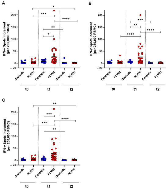 SARS-CoV-2-specific cellular immune response before, one month, and three months after Comirnaty Omicron XBB.1.5 vaccination in PLWH and healthy controls. The IFN-γ spot increments for (A) D614G (wild-type), (B) Omicron BA.5, and (C) Omicron XBB.1.5 are depicted. Data from healthy controls are represented by blue circles, while data from PLWH are indicated by red circles. Friedman test with Dunn’s multiple comparison test were utilized to compare responses at different time points within each group, while a one-tailed Mann–Whitney test was employed to compare responses between the cohorts (* p < 0.05, ** p < 0.01, *** p < 0.001, **** p < 0.0001). Median is represented by horizontal lines.