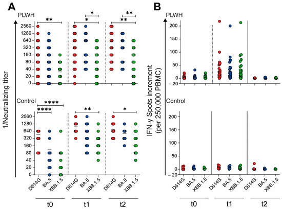 To evaluate the impact of the adapted vaccination on the neutralizing capacity of antibodies against different SARS-CoV-2 variants, we compared the neutralizing antibody titers across time points and variants. In the cohort of PLWH, the neutralizing antibody titers against the D614G variant were significantly higher compared with those against Omicron XBB.1.5 at all time points: baseline (t0: p = 0.0058), 4 weeks post vaccination (t1: p = 0.021), and 12 weeks post vaccination (t2: p = 0.0067), as shown in Figure 5A. Similarly, in the control cohort, the neutralizing titers for D614G were significantly higher than those for both Omicron BA.5 and XBB.1.5 (p < 0.0001) at baseline (Figure 5A). This significant difference persisted for D614G compared with Omicron XBB.1.5 at both post-vaccination time points: 4 weeks (t1: p = 0.0025) and 12 weeks (t2: p = 0.037) after vaccination. These results suggest that while the adapted vaccination elicited a robust antibody response, the neutralizing capacity remained variant-dependent, with consistently higher titers against the D614G variant compared with newer Omicron subvariants across both cohorts and all time points.