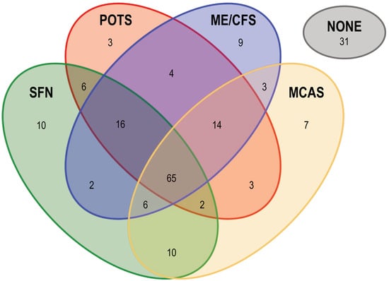 Overlap of complex dysautonomia syndromes with symptoms reported by the PACVS study cohort. ME/CSF, POTS, MCAS, and SFN were assigned to the study participants according to published guidelines [4,5,7,8]. PACVS subjects were assigned a given syndrome if exhibiting n ≥ the cohort average of symptoms associated with that syndrome or if diagnosed after vaccination with that syndrome by a physician. A total of n = 31 PACVS subjects could not be assigned to any of the four syndromes (labeled “NONE”). Numbers indicate the n of study participants assigned to a given syndrome or syndrome intersection.