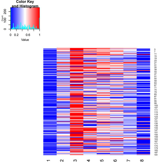 Matching of study participants to symptom clusters. Study participants were assigned to the eight clusters (Figure 2) based on the modified Jaccard index (mean of Jaccard index and Jaccard index of the negated values). Participants highlighted in red strongly matched the symptom cluster, those in white moderately matched the cluster, and those in blue matched the cluster poorly or not at all (value = 1: strong correlation with the cluster based on the modified Jaccard index; value = 0: no correlation with the cluster based on the modified Jaccard index).