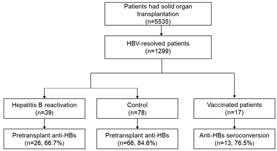 This matched case–control study was conducted at Severance Hospital, which is a large tertiary teaching hospital with 2400 beds in South Korea. We identified SOT recipients who underwent transplantation at this research hospital between January 2005 and April 2023. The procedures involved KT, liver transplantation (LT), lung transplantation (LuT), and heart transplantation (HT). The preoperative HBV serostatus was routinely assessed at the study institution based on anti-HBs, HBsAg, and anti-HBc. We excluded patients who did not undergo preoperative HBV serologic testing because the presence of HBV could not be determined. Patients with HBsAg(−) and anti-HBc(+) were defined as having resolved HBV infections and were included in this study.