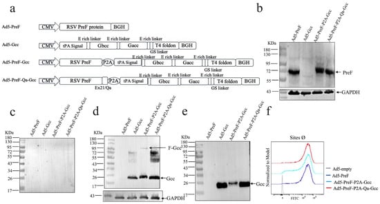 Designing and characterizing the Ad-based vaccines. (a) Schematic of Ad5-PreF, Ad5-Gcc, Ad5-PreF-P2A-Gcc and Ad5-PreF-Qa-P2A-Gcc. (b,c) Western blot analysis of F expression in cell lysis (b) and supernatant (c). (d,e) Western blot analysis of Gcc expression in cell lysis (d) and supernatant (e). (f) Identification of the conformation of F protein. Ad5-empty was used as control. Site Ø represents the unique antigenic sites of PreF.
