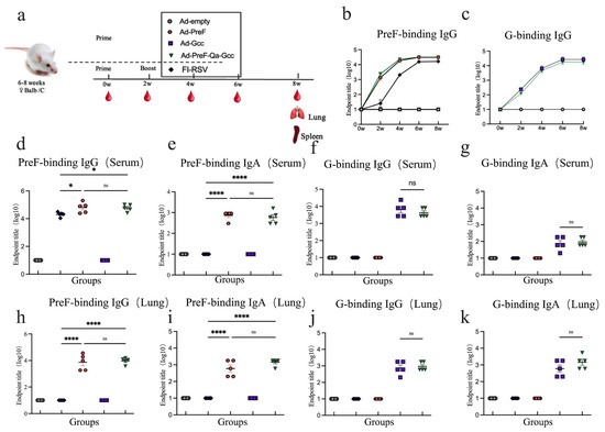 Immune responses in immunized Balc/c mice. (a) Schedule of Ad5 vaccines immunization and bleeding strategies in female Balb/C mice. (b) Kinetics of PreF-specific total IgG reciprocal endpoint titers (log10) were measured within 8 weeks of initial vaccination. (c) Kinetics of G-specific total IgG reciprocal endpoint titers (log10) were measured within 8 weeks after vaccination. (d) Endpoint titer of PreF-specific total IgG was measured in serum at week 6. (e) Endpoint titer of PreF-specific total IgA was measured in serum at week 6. (f) Endpoint titer of G-specific total IgG was measured in serum at week 6. (g) Endpoint titer of G-specific total IgA was measured in serum at week 6. (h) Endpoint titer of PreF-specific total IgG was measured in BALF at week 8. (i) Endpoint titer of PreF-specific total IgA was measured in BALF at week 8. (j) Endpoint titer of G-specific total IgG was measured in BALF at week 8. (k) Endpoint titer of G-specific total IgA was measured in BALF at week 8. ns = not significant; * p < 0.05, **** p < 0.0001.