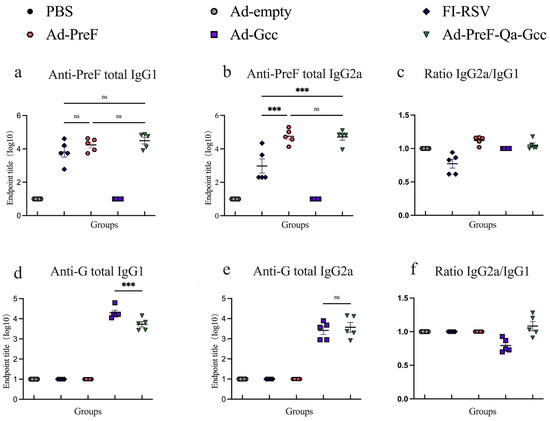 Intranasal immunization induced a balanced Th1/Th2 immune response in mice vaccinated with Ad-PreF-Qa-P2A-Gcc. (a–c) Anti-PreF antibody subtype IgG1 (a) and IgG2a (b) were detected in serum at week 6, and the ratio of IgG2a/IgG1 (c) was calculated. (d–f) Anti-G antibody subtypes IgG1 (d) and IgG2a (e) were detected in serum at week 6, and the ratio of IgG2a/IgG1 (f) was calculated. ns = not significant; *** p < 0.001.