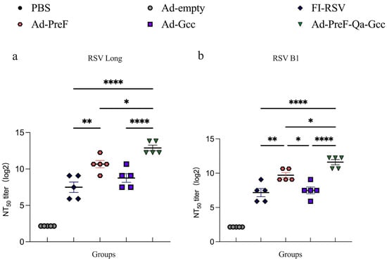 The results of the neutralizing antibody (NAb) test showed that all groups induced specific RSV Long and RSV B1 NAb except for the Ad5-empty group in the sera of the vaccinated mice (Figure 4). The NAb titers in the Ad-Gcc vaccinated mice were similar to those of the vaccinated FI-RSV group; in comparison, those of the other groups were higher. Single intranasal immunization with Ad5-PreF-Qa-Gcc resulted in high NAb titers against RSV Long and RSV B1 when compared to the results noted for Ad5-PreF. The NAb titers were on average 4.6-fold and 3.7-fold higher for Ad5-PreF-Qa-Gcc compared to Ad5-PreF (Figure 4a,b), suggesting that the combination of PreF and the Gcc antigen increased the NAb titers compared to PreF or Gcc alone.