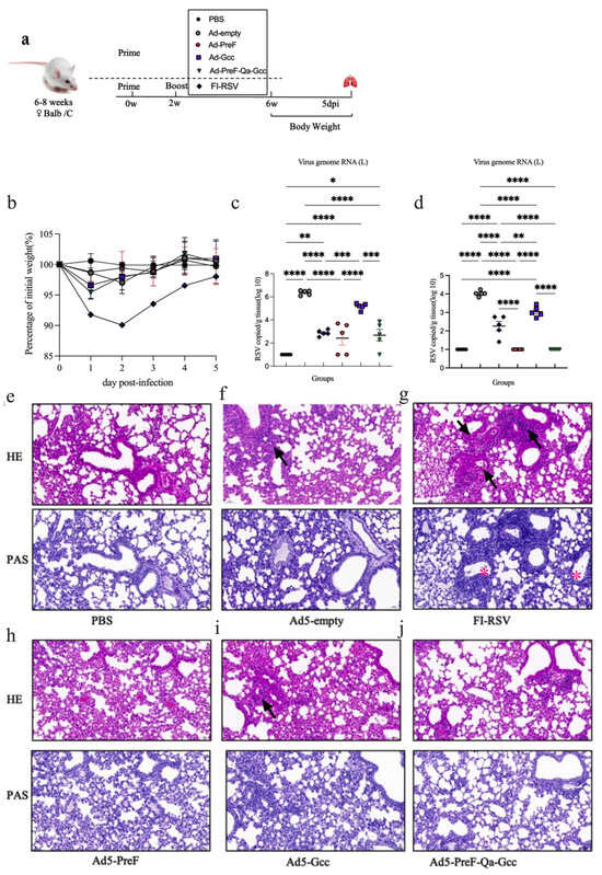 Immunogenicity and protective efficacy in BALB/c mice. (a) Schematics of vaccine immunization and challenge in BALB/c mice (6–8 weeks old). Mice were challenged with 2 × 106 pfu RSV Long via the i.n. route at 4 weeks after boost vaccination. (b) Body weight change over 5 days post-infection. (c,d) Copies of RSV viral L gene in lung tissue (c) and nasal tissue (d). The limit of detection for the RT-qPCRs is 10 copies/mL. (e–j) Tissue sections of the lung tissues were stained with H&E and PAS for pathological examination. The magnification of all images is 20x. All data are shown as means ± SEM. p-values were analyzed with one-way ANOVA (* p < 0.05; ** p < 0.01; *** p < 0.001; **** p < 0.0001).