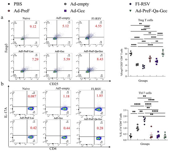 A delicate balance between the Th17 and Treg cell subsets could play an important role in the pathogenesis of RSV infection. During RSV infection, the functions of both subsets are the opposite of one another regarding viral clearance and clinical severity. Th17 cells are known to promote inflammation, which can even result in autoimmunity. Treg cells attempt to control the pathology of VED in RSV infection [27,28]. The FI-RSV vaccinated mice showed enhanced recruitment of CD4 + T cells accompanied by the depletion of Treg cells from the lung, resulting in severe lung injury occurring upon RSV infection [29]. Durant et al. reported that Treg cells can prevent Th2 immune responses and pulmonary eosinophilia during respiratory syncytial virus infection in mice [30]. Our results also support this notion. The number of Treg cells in the FI-RSV vaccinated mice following RSV challenge significantly decreased compared with the mice challenged with PBS, and severe lung pathology was observed in their lung tissue. In contrast, the number of Treg cells in the mice vaccinated with Ad5-PreF and Ad5-Gcc significantly increased. Interestingly, Treg cells in the mice vaccinated with Ad5-PreF-Qa-Gcc significantly increased, and no significant difference was noted compared to the mice vaccinated with PBS (Figure 6b).