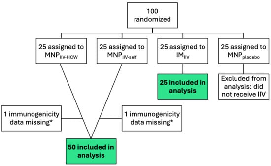 Participant Flow Diagram. Adapted from TIV-MNP 2015 [49] for secondary analysis. * Reactogenicity and covariate data of participants with missing immunogenicity data were included. Green boxes with bold type represent the participants included in the sample for analysis.