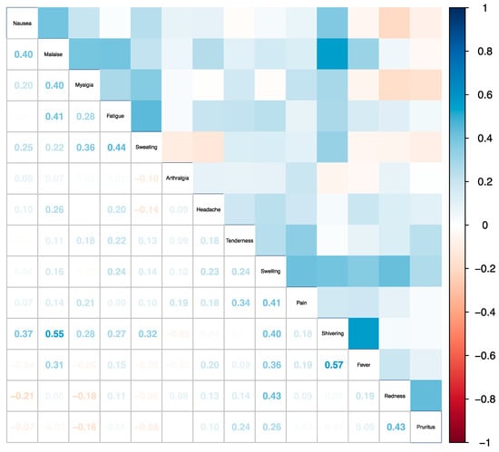 Figure 2 displays the correlation matrix between all types of solicited adverse events. Most Pearson correlation coefficients were close to 0, and there was no discernible hierarchical clustering pattern between events.