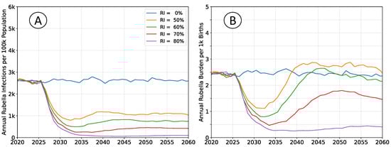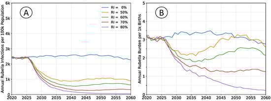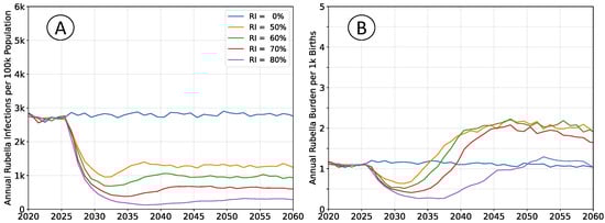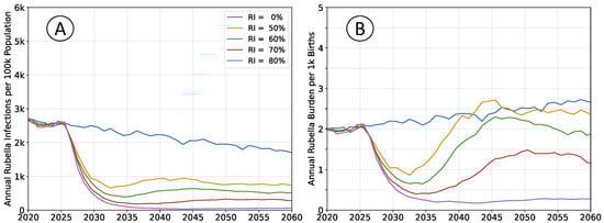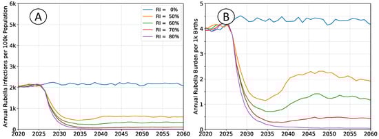. (A) Mean annual incidence of rubella virus infections per 100 k total population as a function of time following RCV introduction through routine immunization only. (B) Mean annual burden of rubella virus infection per 1 k births.