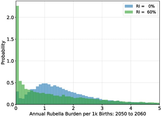 Histograms of annual rubella burden estimated over the period 2050 to 2060 for simulations of steady-state populations with no vaccination and with