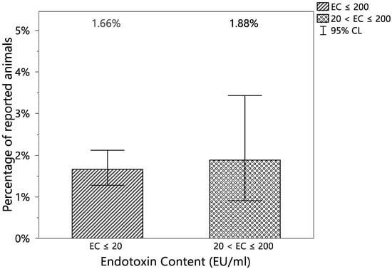 No trend was apparent in the percentage of animals with at least one VetCare report potentially correlated to the presence of endotoxins in the different EC level groups (Table 1 and Figure 2), and all 95% upper confidence limit of the percentages are lower than 5%, with a maximum difference in the estimates of the percentage of animals of just 0.21% between the groups with lowest and highest EC.