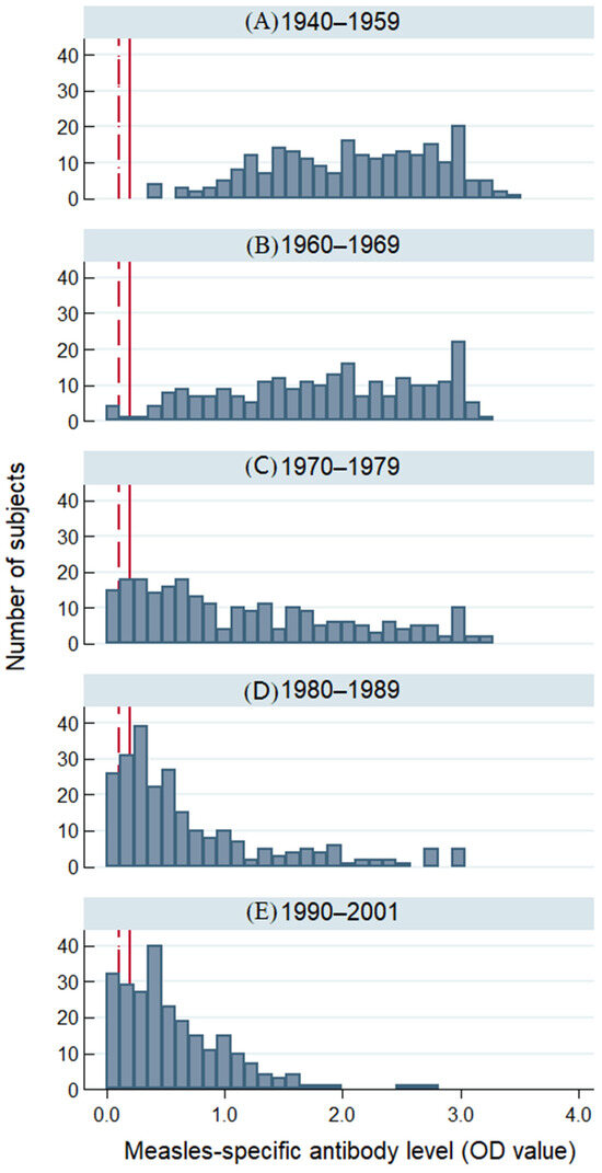 Distribution of measles-specific IgG antibody levels measured by ELISA (optical density values) in Australian plasmapheresis donors that donated from 29 October to 14 November 2019, by birth year cohorts: (A) 1940–1959, (B) 1960–1969, (C) 1970–1979, (D) 1980–1989, and (E) 1990–2001. The dark red line shows a positive cut-off for assay (OD = 0.2). OD values >0.2 suggest immunity. The dark red dotted line shows an equivocal cut-off (OD = 0.1). OD values 0.1–0.2 are considered equivocal; OD values < 0.1 are negative and therefore considered non-immune.