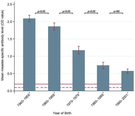The mean measles-specific antibody levels decreased significantly from older to younger cohorts (1940–1959: OD 2.09 ± 0.09, vs. 1990–2001: OD 0.58 ± 0.04, 95% CI). Differences between groups were statistically significant in all birth year cohorts (p < 0.05) except for the 1980–1989 and 1990–2001 cohorts (Figure 2). There was no significant change to the results when the 1940–1959 cohort (n = 232) was separated into two groups (1940–1949 and 1950–1959) nor when subjects in the 1940–1949 group (n = 43) were excluded. There was a moderate, negative correlation between measles-specific antibody ELISA OD values and year of birth (Pearson’s r = −0.629, p < 0.0001) (Appendix A).