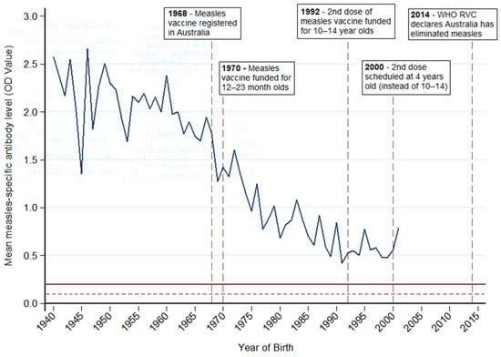 Mean measles-specific IgG antibody levels optical density (OD) values measured by ELISA in Australian plasmapheresis donors who donated from 29 October to 14 November 2019 by year of birth, and milestones for vaccination and control of measles in Australia [35,36]. The dark red line shows a positive cut-off for assay (OD = 0.2). OD values > 0.2 suggest immunity. The dark red dotted line shows an equivocal cut-off (OD = 0.1). OD values 0.1–0.2 are considered equivocal; OD values < 0.1 are negative and therefore considered non-immune.
