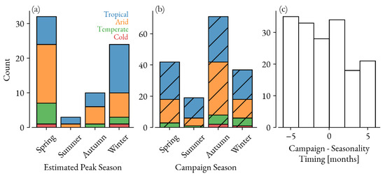 (a) Estimated measles peak seasons at the national level and further aggregated by Köppen–Geiger climate classification [21]. (b) The aggregated timing of SIA campaigns from 2000 to 2020. (c) The resulting offset distribution between campaign timing and the estimated seasonality.