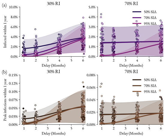 Measles transmission dynamics were simulated in a well-mixed population with routine immunization, vital dynamics, and an optimized calendar of SIAs. The trade-off between SIA coverage and timeliness in Figure 2 is assessed by two different metrics. The top two panels show the outbreak size as measured by the total number of people infected over the next year after the SIA was scheduled to occur. The bottom two panels show the outbreak intensity as measured by the maximum peak daily incidence over that year. These metrics are calculated for each simulation as the SIA is delayed by 1, 2, 4, and 6 months. The results for 50%, 70%, and 95% coverage SIAs are visualized with added noise in the x-dimension (time) for the visualization. The mean trend over the entire set of simulations is depicted by the solid line; shaded regions correspond to the 95% confidence intervals. For the 30% RI coverage scenario, the 50% SIA delayed by 1 month has a smaller and less intense outbreak than the 95% SIA delayed by 6 months. This trade-off only reverses after 5 months of delay for the 50% SIA. For the 70% RI coverage scenario, the 50% and 70% SIAs do not change appreciably with the delay due to our modeling assumption that SIA doses are administered first to children who have received a dose via RI (see Section 2.2).