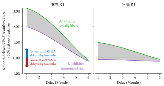 Different dose associations for previous immunization will impact how much, if at all, the well-timed but lower-coverage SIA will perform compared to the delayed, higher-coverage SIA. In these figures, the difference in outbreak size between the 95% coverage SIA delayed by 6 months and the 50% SIA delayed between 1 and 6 months is plotted for two bounding assumptions. The purple line shows the results for SIA doses going first to children who received a dose via RI. The green line shows results for all children being equally likely to receive a dose during the SIA.