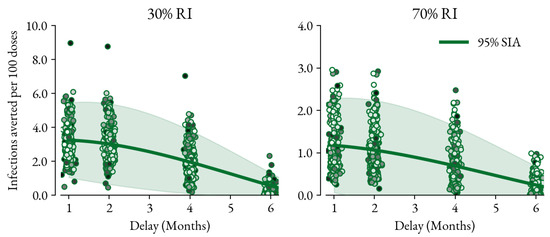 For the analysis, two values of RI coverage (30% and 70%) are considered to highlight the differences between low- and higher-coverage settings [29]. SIA coverage values are run at 50%, 70%, and 95%. The highest SIA coverage reflects the current recommendation of 95% coverage both on aggregate and in each district [9], which is more stringent than measles elimination strategies that aim for 95% coverage in combination between RI and SIAs [30,31].