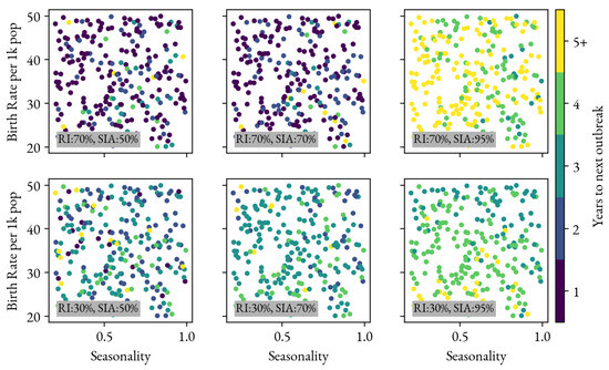 Along with the immediate effect of the SIA in reducing the next year’s infections, longer-term effects are considered by showing the number of years until the next outbreak in Figure 5. Each individual sub-panel shows results for RI and SIA coverage level combinations. Each simulation is plotted as an individual circle whose color indicates the number of years until the next outbreak. These SIAs are not delayed. As seen in Figure 2, an SIA coverage of less than 70% has limited effect for the higher RI coverage scenario (70%). This produces the counter-intuitive result that simulations with 30% RI and 70% SIA coverage have more time between outbreaks than simulations with 70% RI and (essentially useless due the dose association assumption) 50% or 70% SIAs. However, looking across the different coverage scenarios, higher-coverage and timely SIAs will not only reduce burden for the coming year (Figure 2) but also increase the number of years until the next outbreak. A dependence on birth rate can also be observed. Both of these results are consistent with previous studies (e.g., [13]).