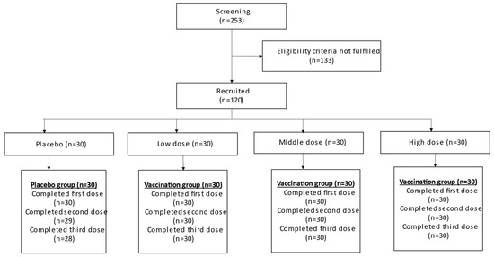 A total of 253 participants were screened in this study, with 120 participants eligibly enrolled and 118 completing the study. Two participants from the placebo group withdrew during the second and third doses of vaccination. All participants from the low-, medium-, and high-dose experimental groups completed all three vaccinations. The details are illustrated in Figure 1.