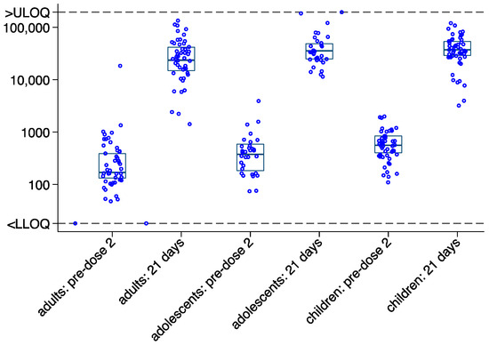 Amongst 133 paired samples, linear regression was used to model 21 days post-dose 2 data on the log10 scale, conditional on pre-dose 2 (day 0) values on the log base10 scale, to investigate differences in fold change (fold increase) by age group. The analysis showed post-dose 2 antibody values to be higher in adolescents compared to adults (regression coefficient: 0.175, 95% CI: 0.126, 0.338, p = 0.035), when accounting for pre-dose 2 values. However, there was no significant difference between children and adults (regression coefficient: 0.097, 95% CI: −0.056, 0.250, p = 0.214). More variability in pre-dose 2 values can be seen in the adult group (Supplementary Figure S1).
