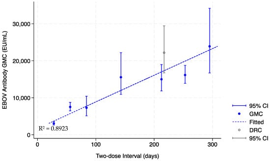 The heightened immunogenicity induced by late dose 2 administration in this study is reminiscent of the out-of-window antibody results obtained in EBL2002. In that trial, 169 healthy adult participants also received dose 2 beyond the protocol-defined window due to a temporary study pause [8]. As the two-dose interval extended from 56 to ≥280 days among these EBL2002 adult participants, the 21 days post-dose 2 antibody GMC increased from 7518 (95% CI 6468; 8740 EU/mL) to 23,897 EU/mL (95% CI 16,703; 34,188) (Figure 4). The GMC reported among the ≥280 days out-of-window EBL2002 adults (median interval 295 days), at 23,897 EU/mL (95% CI 16,703; 34,188), is comparable to the GMC observed among adults in this substudy (median interval 259 days), at 22,194 EU/mL (95% CI 16,726; 29,449). In EBL2002, extending the two-dose interval from 56 to ≥280 days also increased the pre- and post-dose 2 GMC fold change from 21-fold to 113-fold. The positive correlation between the length of the interval and the post-vaccination GMC can be illustrated by plotting the EBL2002 healthy adult data and fitting a curve using ordinary least square linear regression (Figure 4). When the adult data from our substudy are added to the plot, the immunogenicity of the delayed dose 2 in DRC-EB-001 appear consistent with the out-of-window immunogenicity in EBL2002.