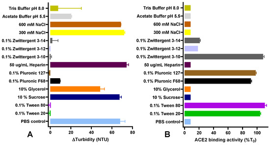 Screening of potential excipient to protect spike protein (D614) against mechanical stress. Spike protein at 170 µg/mL was subjected to mechanical stress at ambient temperature in an orbital shaker at 250 RPM for 24 h. Turbidity (A) and ACE2 binding activity (B) was measured before and after mechanical stress (n = 2). Turbidity is presented as Delta turbidity, which corresponds to the turbidity measured at 24 h of mechanical stress minus the turbidity obtained at time zero. ACE2 binding activity is presented as percentage of activity obtained at 24 h of mechanical stress with respect to the activity obtained at time zero. Unless otherwise noted, all experiments were performed in 10 mM PBS pH 7.0.