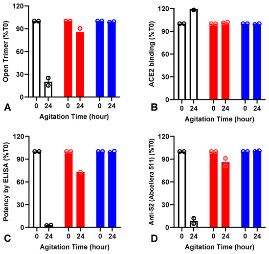 The ancestral spike antigen (D614) was utilized to screen excipients that can potentially prevent aggregation. The ancestral spike antigen in different buffering conditions was prepared at 170 µg/mL and filled into 3 mL glass vials at 0.68 mL/vial. The vials were placed securely on a horizontal fashion orbital shaker (VWR model 3500, Radnor, PA, USA) at ambient temperature and agitated at 300 rpm for 24 h as previously described [15]. The samples were evaluated by testing turbidity and ACE2 binding before and after agitation in the presence of potential stabilizers. In experiments evaluating the effect of Tween 20 concentration, in vitro potency by enzyme-linked immunosorbent assay (ELISA), open trimer peak area by size exclusion chromatography-ultra-performance liquid chromatography (SEC-UPLC), ACE2 binding and anti-S2 binding were tested before and after agitation.