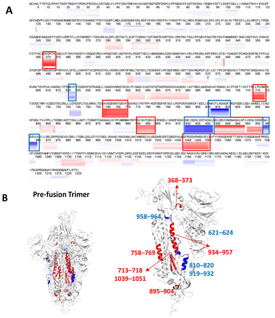To gain further insight into the conformational and/or structural changes in the spike protein when subjected to mechanical stress, we employed HDX-MS to understand how agitation stress affected the conformation of the spike protein. HDX-MS studies were conducted on spike protein ancestral strain (D614) samples containing 0.02% (v/v) Tween 20 since, under this condition, the CD and fluorescence experiments exhibited significant spectral changes (Supplementary Figure S4), thereby enhancing the likelihood of detecting structural alterations to the protein. Native and agitated samples of the spike protein were compared. Based on the HDX-MS heatmap analysis, as shown in Figure 3A, differences in deuterium uptake were detected when the spike protein was agitated. These changes were mainly localized in the S2 stalk region, with minimal impact on the receptor binding domain and S1 domain. Residues 713–718, 758–769, 895–904, 934–957, and 1039–1051 showed an increase in deuterium uptake, whereas residues 621–624, 810–820, 919–932, and 958–964 showed a decrease in deuterium uptake. Residues 368–373 of the S1 domain were also affected where there was an increase in deuterium uptake when agitated. Figure 3B shows the same HDX-MS data mapped onto the three-dimensional structure of the pre-fusion spike protein (D614). A majority of the residues that exhibited increased deuterium uptake upon agitation were localized in the hydrophobic core of the S2 domains (trimeric interface region) of the pre-fusion trimeric structure, sequestered from the solvent, whereas the residues that showed a decrease in deuterium uptake were localized in the solvent-exposed region. The increases in deuterium uptake could indicate more solvent exposure in these regions or disruption of the hydrogen bonding network, while the decreases in deuterium uptake were likely the result of diminished solvent exposure or of the enhanced hydrogen bonding network formed to stabilize the secondary structure. The HDX-MS results indicate that the conformational changes induced by agitation were primarily in the S2 domain. Spike protein is known to adopt an open trimeric form when stored at 2 °C to 8 °C [6]. Based on the HDX-MS analysis (shown in Figure 3B), the S2 stalk regions exhibited increases in deuterium uptake, which could indicate further extension/expansion of the trimeric conformation. The interpretation of the HDX-MS data supports the SEC-UPLC analysis of the agitated spike protein, where an early eluting species, implying an increase in the Stokes radius (extended trimer, Figure 2A), was observed. Furthermore, the minimal changes in deuterium uptake in the S1 domain, indicative of a stable structure for the receptor binding domain, were also supported by consistent ACE2 binding for both the native and agitated samples, as shown in Figure 2B (0.02% Tween 20).