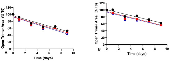 Effect of Tween 20 concentration on the thermal stability at 37 °C of ancestral spike protein (D614) at 170 µg/mL (A) and at 60 µg/mL (B). Formulations containing 0.02% Tween 20 (black circles), 0.1% Tween 20 (red squares), 0.2% Tween 20 (blue triangles) were incubated at 37 °C and the trimeric conformation of the spike protein was measured at different timepoints by SEC-UPLC. The results are presented as native trimer area as a percentage of time zero. No significant differences in the zero-order rate constant were obtained by ANCOVA when comparing the different concentration of Tween 20 for 170 µg/mL spike protein (p = 0.918) and 60 µg/mL spike protein (p = 0.985).