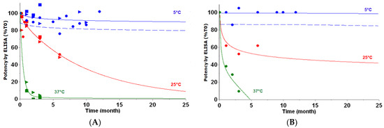 The kinetic analysis of the stability data was performed using AKTS—Thermokinetics software (version 5.51, AKTS AG, Advanced Kinetics Technology Solutions, Siders, Switzerland) as previously described [20,21]. Briefly, various Arrhenius-based models, from simple to more sophisticated ones, are screened to fit short-term in vitro ELISA potency stability data obtained at typical storage temperature (5 °C) and higher temperatures (25 °C, 37 °C, and 41 °C). The simplest model best describing the progress of the change in the considered attribute is then selected using statistical scores such as weighted Akaike and Bayesian Information Criteria (wAIC/wBIC). When the wAIC and wBIC criteria identified two different models, both were considered to perform multiple bootstraps. Using this multiple model bootstrap (MMB) approach, a bootstrap was made on a single model, with the number of loops (Nloops) being proportional to its respective values of the weights wAIC and wBIC, then leading to a one-sided lower 95% prediction interval (PI). The design of the experiments ensured that the modeling practices recommended for accelerated stability predictions of bioproducts were followed [22,23,24]. Long-term predictions of the stability of potency data from the in vitro potency measured by ELISA for products stored under the recommended storage condition (5 °C), including a short excursion at ambient temperature, were also determined using the selected models and corresponding PIs.
