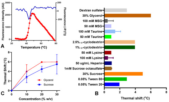 (A) Representative extrinsic fluorescence heating trace (red circles) and the first derivative (blue line) for spike protein (D614) in PBS 0.02% Tween 20, pH 7.0. (B) Screening of potential stabilizers of spike protein (D614) by thermal shift assay. The effect of the stabilizers on the stability of spike protein is plotted as follows: Thermal shift = Tm (Stabilizer) − Tm (Control). (C) Effect of the concentration of glycerol and sucrose on the thermal shift in spike protein. Data are presented as mean ± standard deviation (n = 2).