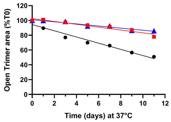 Effect of 20% glycerol and 30% sucrose on the thermal stability at 37 °C of spike protein (D614) at 60 µg/mL. Formulations containing 0.2% Tween 20 in PBS (black circles), 0.2% Tween 20 plus 20% glycerol in PBS (red squares), 0.2% Tween 20 plus 30% sucrose in PBS (blue triangles) were incubated at 37 °C and the trimeric conformation of the spike protein was measured at different timepoints by SEC-UPLC. The results are presented as native trimer area as a percentage of time zero. Extremely significant differences in the zero-order rate constant were obtained by ANCOVA when comparing the different concentration of Tween 20 for 60 µg/mL spike protein (p < 0.0001).
