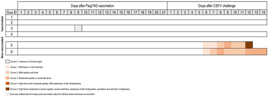 Clinical signs evaluated in pregnant sows after FlagT4G vaccination and CSFV challenge. The clinical signs were monitored daily during the trial. Different colours represent the severity of the clinical signs according to the legend. Sow number 3 was euthanized at 9 dpv, following animal welfare law, despite not showing clinical signs of CSF. Sows 5 and 6 were non-vaccinated, being the CSFV challenge control group.