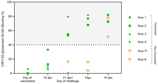 Antibody response generated in pregnant sows after FlagT4G vaccination and CSFV challenge. Sera samples from FlagT4G-vaccinated sows (represented in green symbols) and non-vaccinated sows (represented in orange symbols) were evaluated for the presence of antibodies against E2 using a commercial ELISA. The results are expressed in % blocking, and values above 40% (grey-shaded area) are considered positive. * Sample taken at 12 dpc.